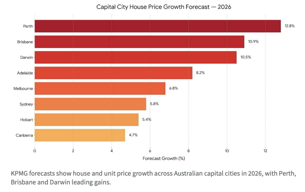 Perth is expected to be the standout performer, with house prices forecast to rise 12.8 per cent in 2026
